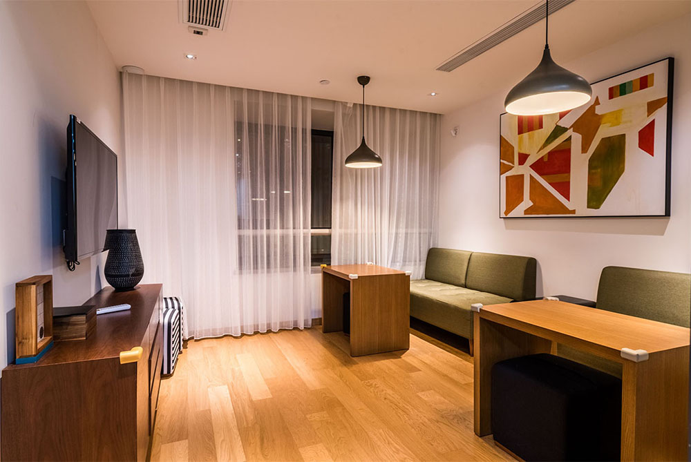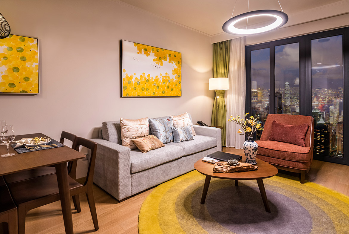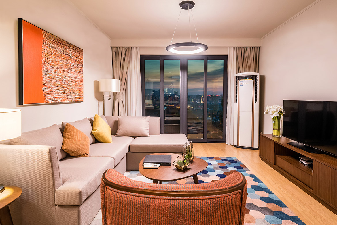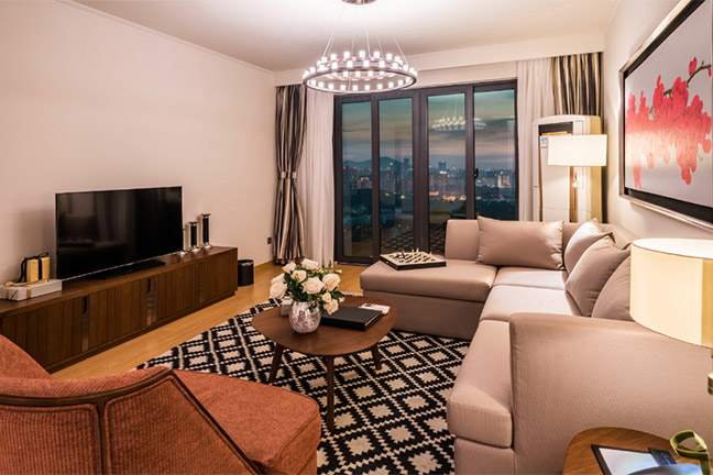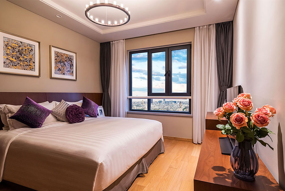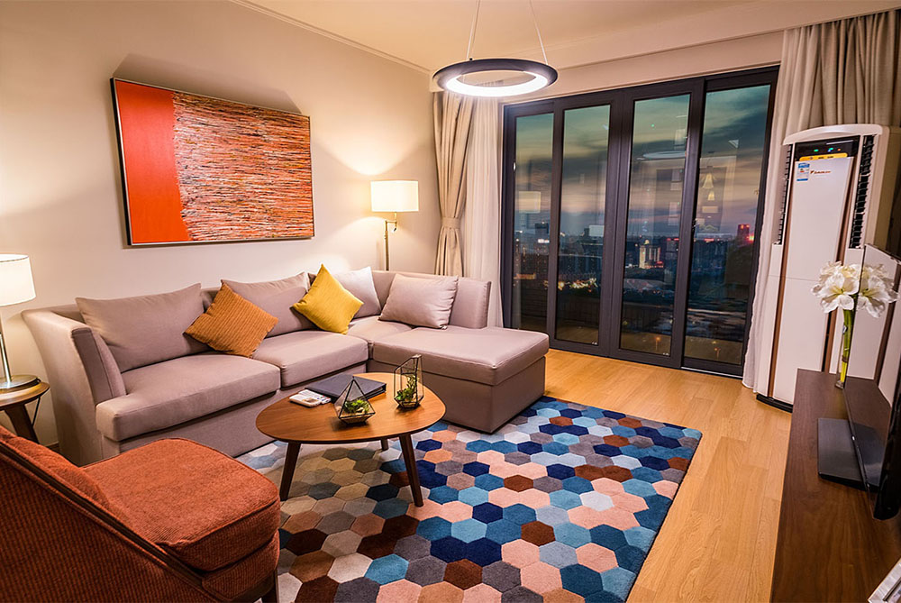 所在楼层14-17楼,一室二厅一卫的格局,房间面积125m²,包含1张1.8m*2m的床,房间可欣赏城市景观,所有客厅都有阳台。该房型24小时热水,配有拖鞋,独立淋浴间,吹风机,以及免费洗漱用品,房间内保险箱,沙发,220伏插座,衣柜,遮光窗帘,床具为鸭绒被,房间内高速上网,房间内配备电热水壶,免费瓶装水,居家冰箱,液晶电视机。厨房配有电磁炉,脱排油烟机。