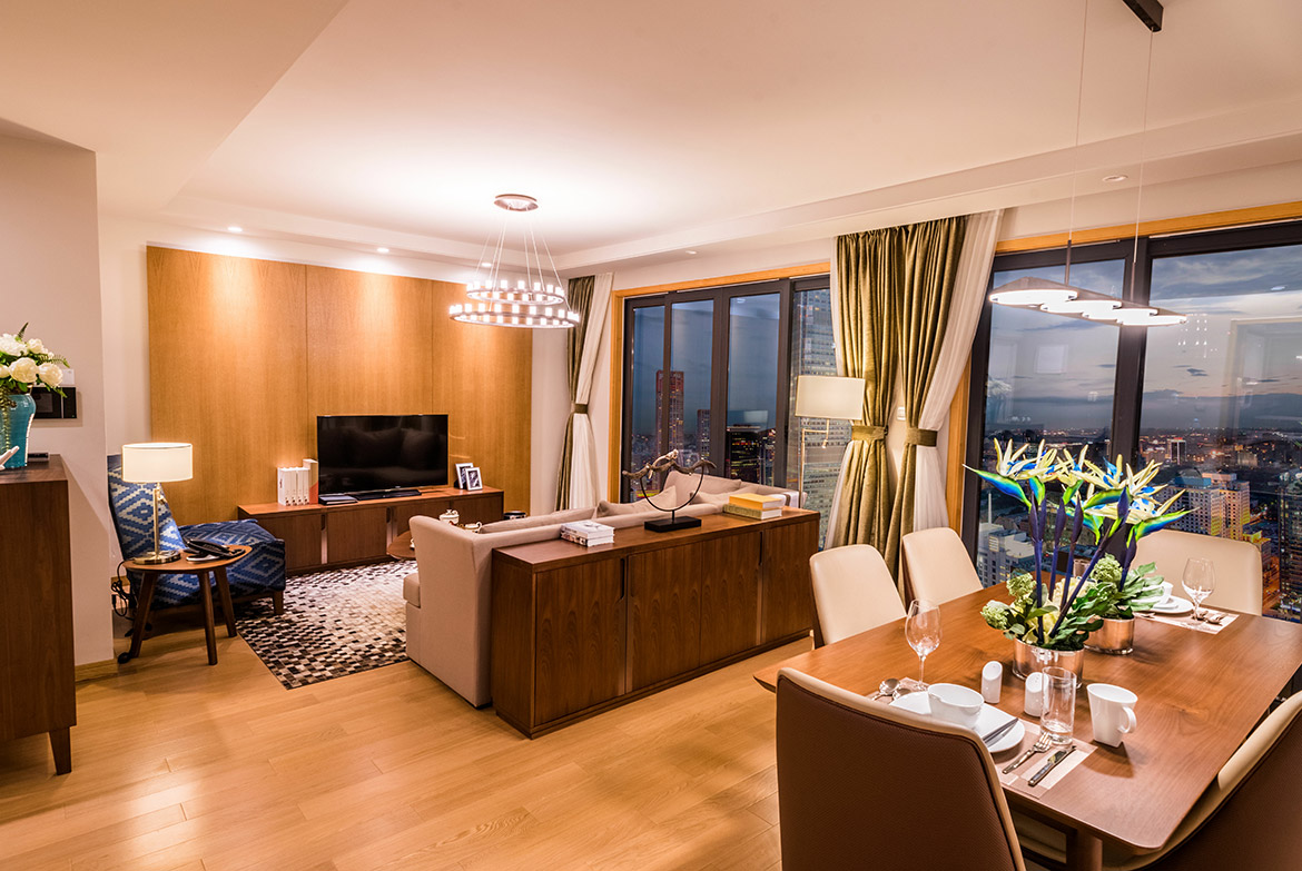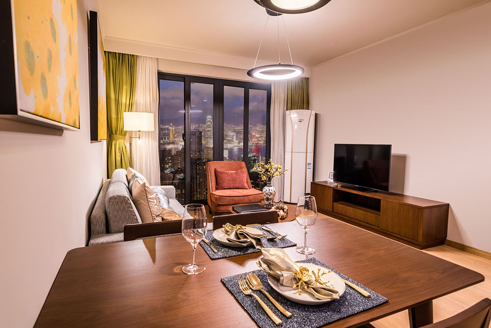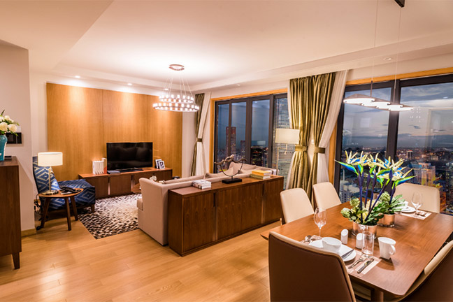 所在楼层3-17楼,三室二厅二卫的格局,房间面积156-158m²,包含1张1.8m*2m的床,2张1.5m*2m的床,房间可欣赏城市景观,所有客厅都有阳台。该房型24小时热水,配有拖鞋,独立淋浴间,吹风机,以及免费洗漱用品,房间独立分体式空调,书桌,房间内保险箱,沙发,220伏插座,衣柜,闹钟,遮光窗帘,床具为鸭绒被,房间内高速上网,房间内配备电热水壶,免费瓶装水,居家冰箱。房间内电话可拨打国内长途,液晶电视机。厨房配有煤气灶,脱排油烟机, 烤箱,洗碗机。