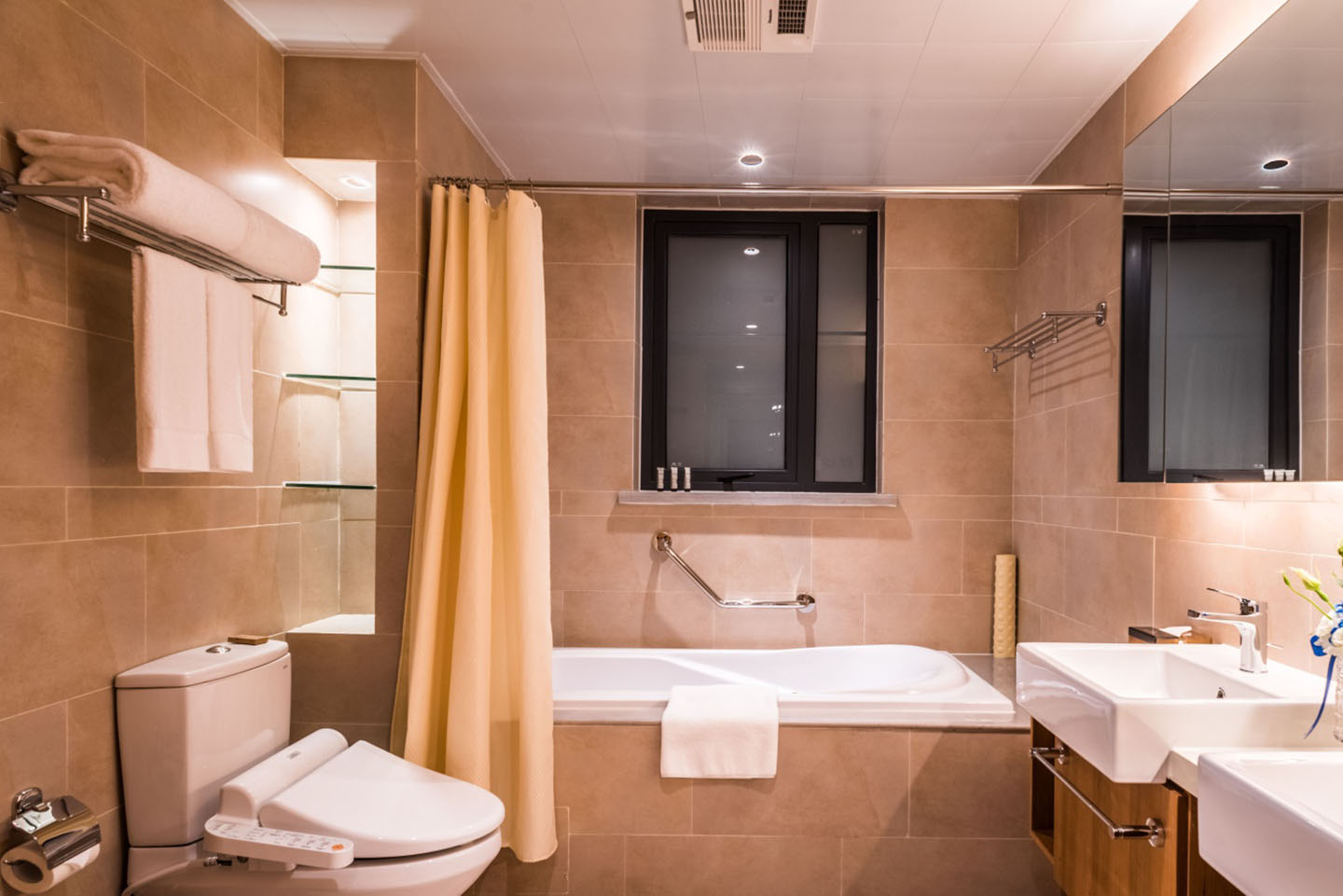 所在楼层14-17楼,二室二厅一卫的格局,房间面积116m²,包含1张1.8m*2m的床,1张1.2m*2m的床,房间可欣赏城市景观,所有客厅都有阳台。该房型24小时热水,配有拖鞋,独立淋浴间,吹风机,以及免费洗漱用品,房间内保险箱,沙发,220伏插座,衣柜,遮光窗帘,床具为鸭绒被,房间内高速上网,房间内配备电热水壶,免费瓶装水,居家冰箱,液晶电视机。厨房配有电磁炉,脱排油烟机。