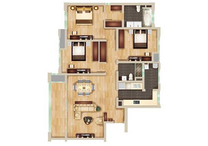 ベッドルーム2室にはデラックスベッドルーム2室とエグゼクティブベッドルーム2室があり、デラックスベッドルーム2室の一部分がベッドルーム1室と書斎1室、一部分が南向きのダブルベッドルーム2室です。エグゼクティブベッドルーム2室は南北ベッドルーム2室で、ベッドルーム3室はベッドルーム2室と書斎1室のあるスタンダードベッドルーム3室と、ベッドルーム3室のあるデラックスとエグゼクティブベッドルーム3室で構成されています。
